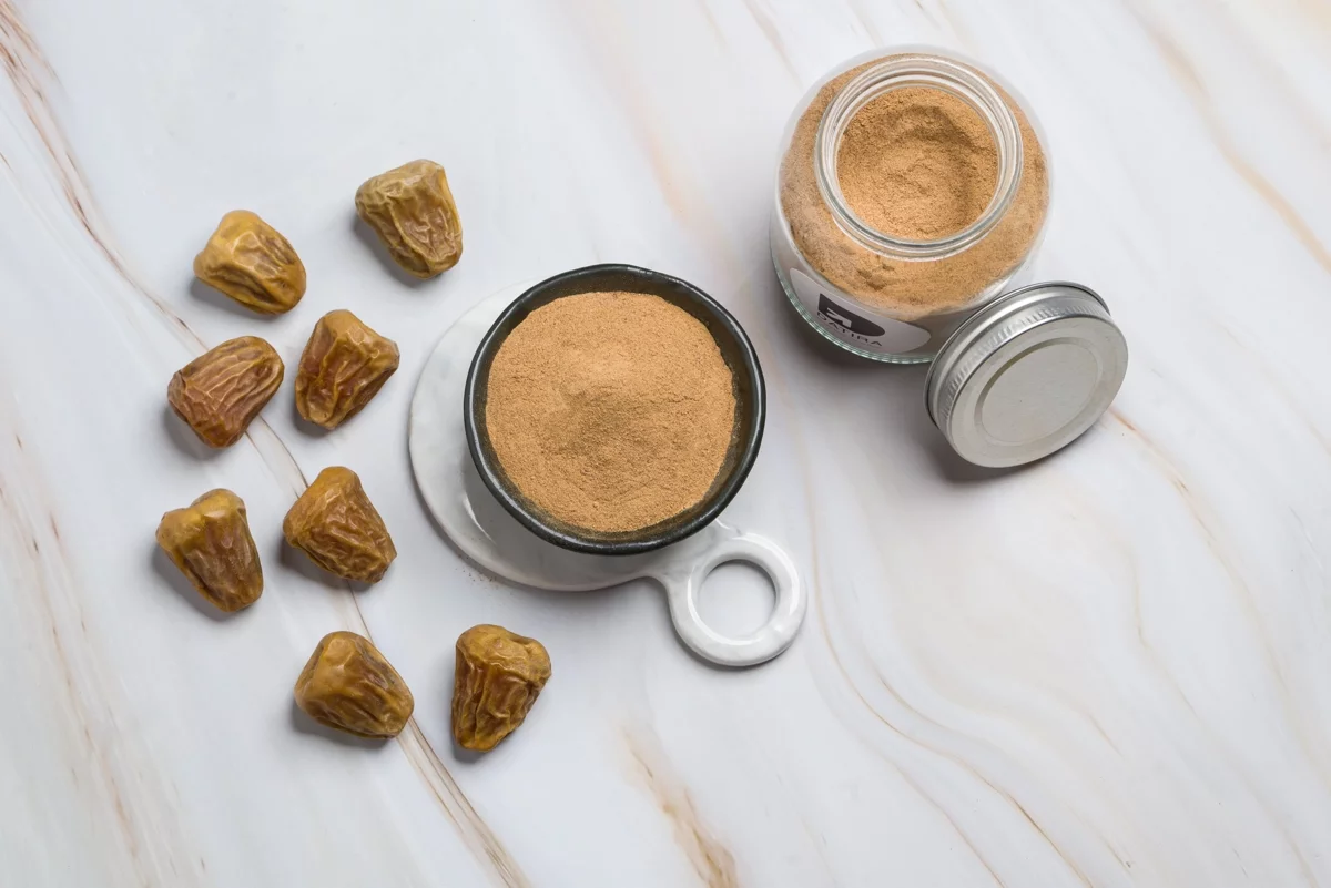 وصف موجّه للمستورد: مسحوق تمور منزوع الرطوبة (≤ 6٪) يُقدَّم كمحلٍّ طبيعي خالٍ من مسببات الحساسية والغلوتين؛ بديل للسكر.